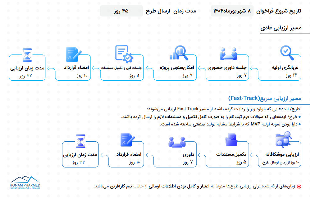 از زمان شروع فراخوان فرایند مسیر ارزیابی شتابدهنده هنام با توجه به این زمان‌بندی خواهد بود: